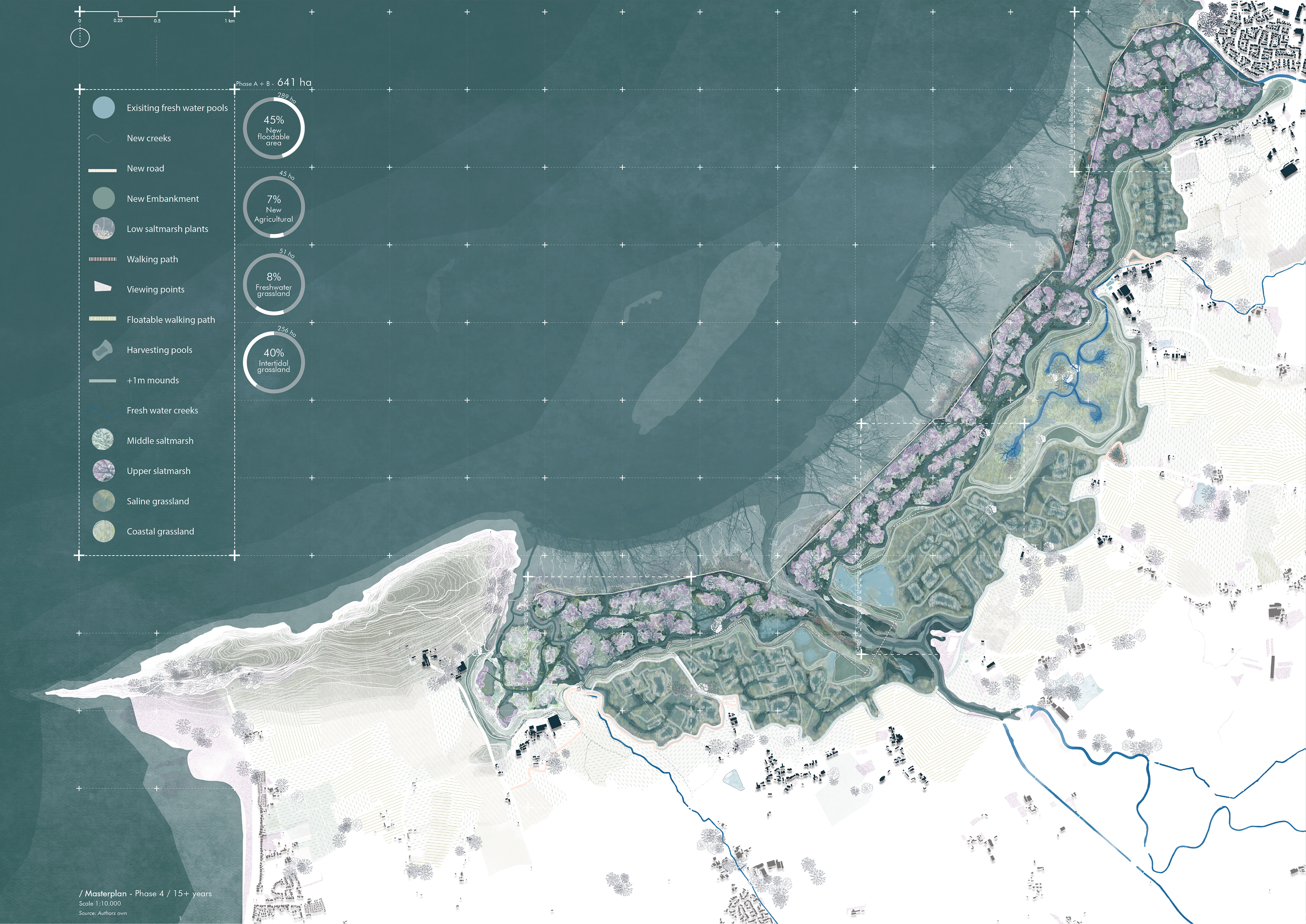 A lo largo del tiempo, el espacio evoluciona hacia un paisaje dinámico, y este marco temporal extendido facilita intervenciones en fases, cada una dirigida a un aspecto ambiental específico. Comenzando con la remodelación del muro costero para crear arroyos de agua interior, los hábitats de marismas salados y el aumento de la vida silvestre se logran mediante brechas controladas en el muro costero. Las fases siguientes implican el contorneo del terreno con un nuevo dique y la reintroducción de especies funcionales.